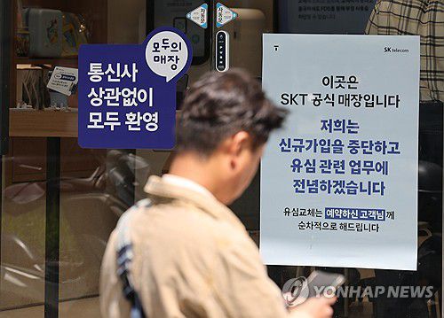서울 시내 한 SK텔레콤 인증 대리점[연합뉴스 자료사진] ▶제보는 카카오톡 okjebo▶연합뉴스 앱 지금 바로 다운받기~▶네이버 연합뉴스 채널 구독하기<저작권자(c) 연합뉴스, 무단 전재-재배포, AI 학습 및 활용 금지>이 기사의 카테고리는 언론사의 분류를 따릅니다.0공유하기
