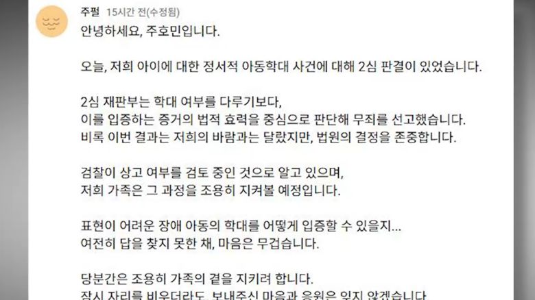 주호민은 유튜브 채널에 "비록 이번 결과는 저희의 바람과는 달랐지만, 법원의 결정을 존중한다"라면서 "검찰이 상고를 검토 중인 것로 알고 있어 우리 가족은 조용히 지켜볼 예정"이라고 밝혔습니다.