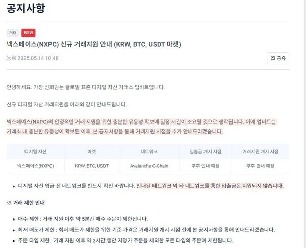 14일 업비트 운영사 두나무는 NXPC의 신규 거래지원 공지를 올렸다. 구체적인 상장 날짜는 공지하지 않았다. 앞서 빗썸 또한 NXPC를 원화 마켓에 추가한다고 밝힌 상태다.