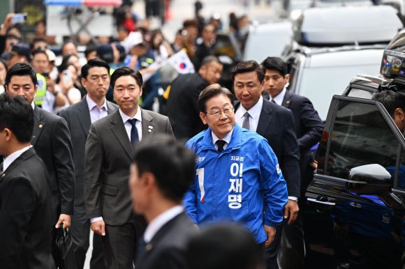 이재명 더불어민주당 대선 후보가 13일 ‘보수의 심장’이라고 불리는 대구광역시의 동성로 거리에 도착해 시민들에게 인사하고 있다.