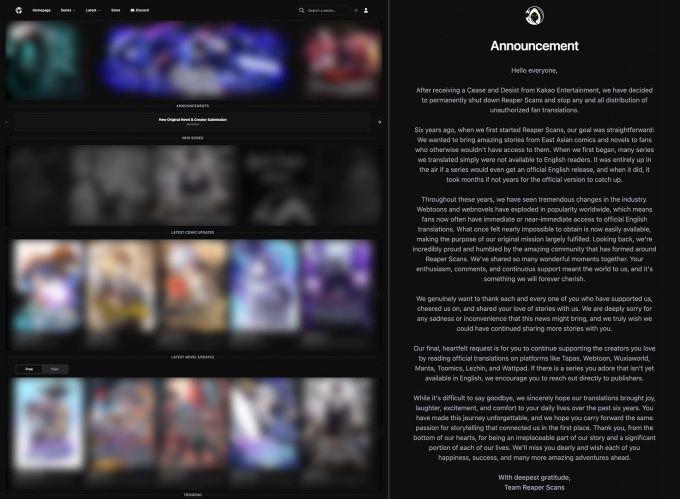 [서울=뉴스핌] 오광수 문화전문기자 = 카카오엔터테인먼트(대표 권기수, 장윤중)가 월 평균 방문수가 1,000만회에 달하는 글로벌 불법 웹툰, 웹소설 사이트 '리퍼스캔스(Reaper Scans)' 폐쇄했다. 카카오엔터테인먼트는 14일 업계 최초의 불법유통대응팀(P.CoK)이 운영자 자체 특정 기술 프로세스로 9일(한국시간) 영어권 대형 불법사이트 리퍼스캔스를 폐쇄했다고 밝혔다.