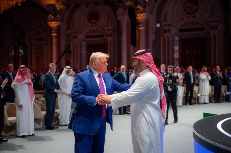 도널드 트럼프(왼쪽) 미국 대통령이 13일(현지시간) 사우디아라비아 리야드에 있는 압둘아지즈 국제 컨퍼런스센터에서 열린 사우디·미국 투자 포럼에서 무함마드 빈 살만 사우디 왕세자와 인사를 나누고 있다. 사우디는 트럼프 대통령의 두 번째 임기 첫 국빈 방문에서 미국과의 방위·인공지능 분야에서 수십억달러 규모의 계약을 약속했다. [UPI] |