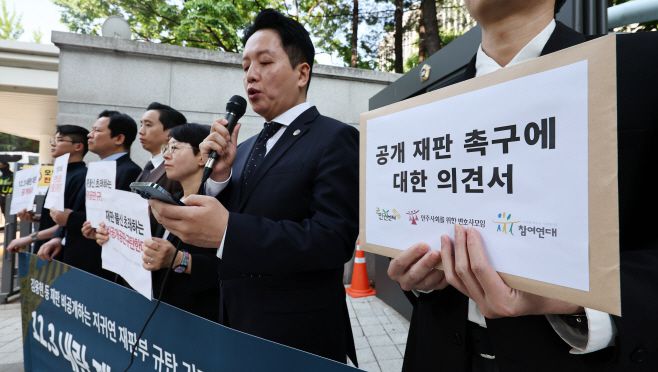 이들은 재판부가 공판을 비공개로 전환한 직후 서울중앙지법에서 '12·3 내란 재판 비공개 지귀연 재판부 규탄 기자회견'을 열고 국민 알 권리를 위해 재판을 공개하라며 목소리를 높였다.