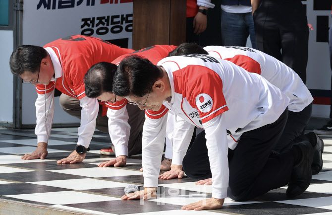 [이데일리 노진환 기자] 김문수 국민의힘 대선후보가 14일 오전 경남 진주시 진주대로 광미사거리에서 열린 선거유세에서 지지자들에게 큰절을 하고 있다.