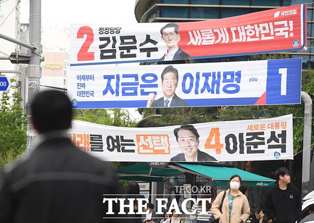 제21대 대통령 선거 공식 선거운동 둘째 날인 13일 오후 서울 마포구 한 거리에 이재명 더불어민주당 대통령 후보와 김문수 국민의힘 대통령 후보, 이준석 개혁신당 대통령 후보의 현수막이 걸려 있다. /장윤석 기자 |