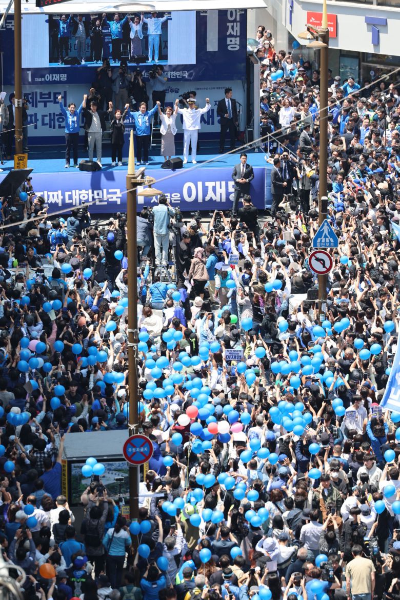 이재명 더불어민주당 대선 후보가 14일부산 부산진구 서면 젊음의 거리에서 열린 유세에서 당원들과 함께 기념촬영을 하고 있다. |