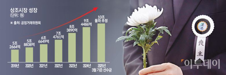 14일 상조업계에 따르면 국내 상조시장 규모는 올해 선수금 10조 원을 돌파한 것으로 추정된다. 공정위에 따르면 상조상품이 99.9%를 차지하는 선불식 할부거래업 시장(3월 기준)은 2019년 선수금 5조2664억 원으로 5조 원의 벽을 넘어선 뒤 급격한 성장세를 이어왔다. 2020년 5조8838억 원, 2021년 6조6649억 원, 2022년 7조4761억 원, 2023년 8조3890억 원, 2024년 9조4486억 원으로 가파르게 성장했다.