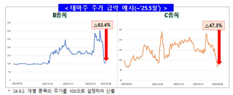 특히 선거일 전·후 주가가 종전 수준으로 회귀하던 과거 사례 등을 감안할 때 현재의 과열 양상은 일시적 비정상 상태라고 평가했다. 일례로 A 종목의 경우, 수년간 적자를 기록했지만 주가순자산비율(PBR)은 코스피 평균의 8배 이상으로 고평가 되고 있다. 특히 특정 정치인에 대한 테마가 소멸될 경우 순식간에 주가가 '반토막'나는 상황이 발생하고 있는 때문에 추종매매시 투자자 손실이 매우 우려되는 상황이다. 정치테마주 대상 종목들은 대부분 자산규모가 영세하며 수익성이 낮은 중소형주로 시장 대비 고평가돼 있으며, 변동성도 매우 높아진 상태다.