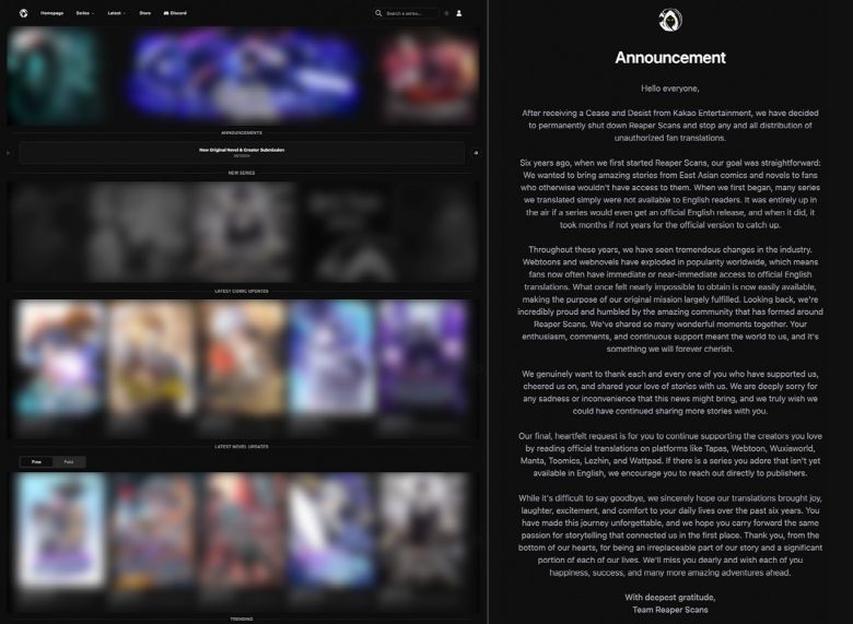 카카오엔터테인먼트(카카오엔터)가 운영자 자체 특정 기술 프로세스를 바탕으로 월평균 방문수가 1000만회에 이르는 글로벌 불법 웹툰·웹소설 사이트 '리퍼스캔스(Reaper Scans)'의 문을 닫게 하는 성과를 냈다.