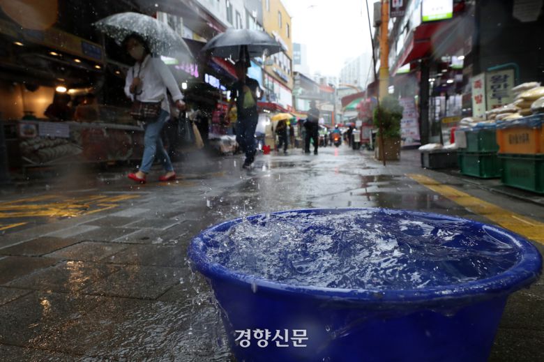 폭우로 침수 피해가 발생했던 서울 동작구 남성사계시장에 비가 내리고 있다. 경향신문 자료사진