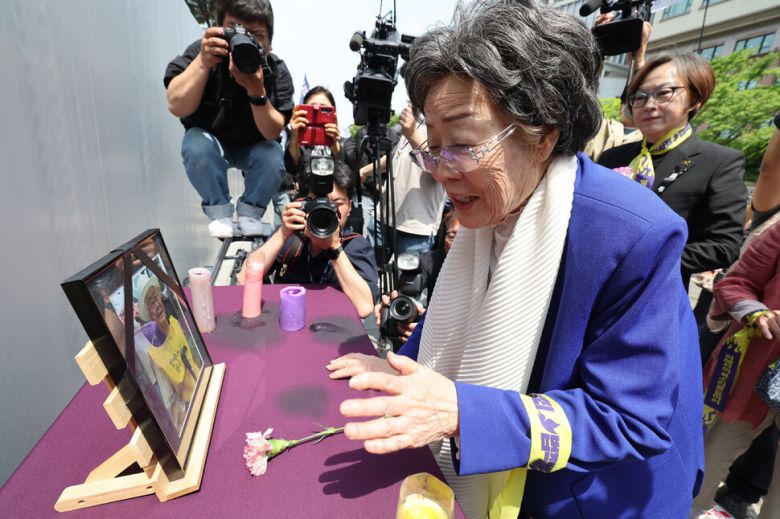 이용수 할머니가 14일 낮 서울 종로구 옛 일본대사관 터 앞에서 열린 제1700차 일본군 위안부 문제 해결을 위한 정기 수요시위를 마친 뒤고 이옥선 할머니 사진 앞에 헌화하고 있다. 백소아 기자 thanks@hani.co.kr