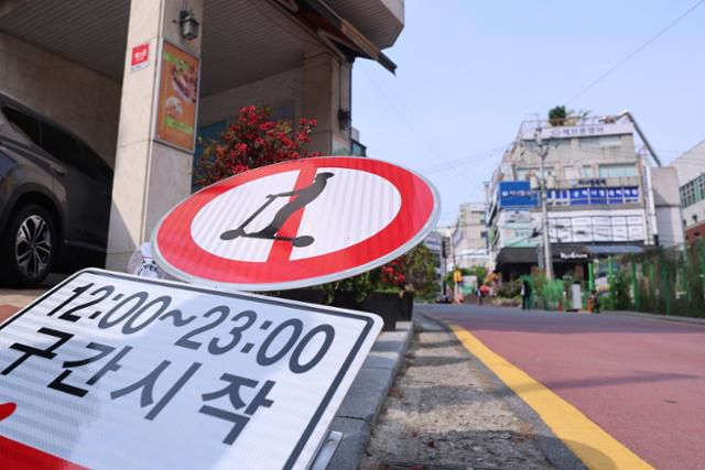 <한국일보> 논설위원들이 쓰는 칼럼 '지평선'은 미처 생각지 못했던 문제의식을 던지며 뉴스의 의미를 새롭게 해석하는 코너입니다.13일 서울 서초구 반포 학원가에 설치되는 킥보드 금지 표지판. 연합뉴스 |