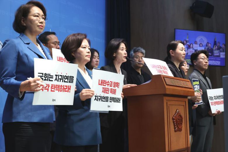 박은정 조국혁신당 의원 등이 지난달 25일, 서울 여의도 국회 소통관서 열린 지귀연 판사 탄핵 촉구 기자회견서 발언하고 있다. ⓒ뉴시스 |