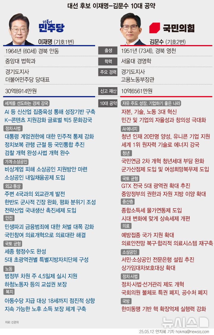 [서울=뉴시스] 이재명 더불어민주당 후보와 김문수 국민의힘 후보 등 대선 주자들이 12일 10대 공약을 발표했다. 이 후보는 공약 1순위로 인공지능(AI) 등 신산업 집중육성을 통한 경제 강국을 내세웠다. 김 후보는 1호 공약으로 '기업하기 좋은 나라, 일자리 창출'을 제시했다. 정치·사법개혁 항목에서는 이 후보는 검찰의 수사·기소 분리와 국방 문민화 및 군 정보기관 개혁 등을 내세웠고, 김 후보는 선관위 감사원 감사허용, 공수처 폐지 등을 공약으로 설정했다. (그래픽=안지혜 기자) hokma@newsis.com |