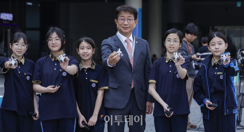 박상우(왼쪽 네 번째) 국토교통부 장관이 14일 서울 강서구 코엑스마곡에서 열린 드론산업 얼라이언스 창립총회에서 학생들과 기념촬영을 하고 있다. 조현호 기자 hyunho@