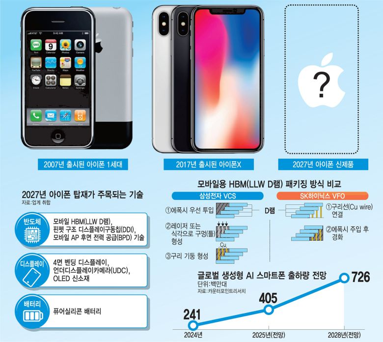 반도체 업계에서는 2027년 전후로 애플이 모바일 HBM을 아이폰에 적용할 것으로 전망하고 있다. 업계 관계자는 “애플이 AI 연산 능력을 끌어올리기 위해 모바일 애플리케이션프로세서(AP) 설계 변경을 검토하고 있다”며 “GPU에 모바일 HBM을 연결하는 방안이 유력하다”고 말했다.