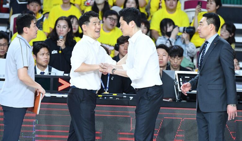 지난 11일 4차전을 앞두고 인사하고 있는 조상현 창원 엘지(LG) 감독(왼쪽 두 번째)과 전희철 서울 에스케이(SK) 감독(왼쪽 세번째). 한국농구연맹 제공