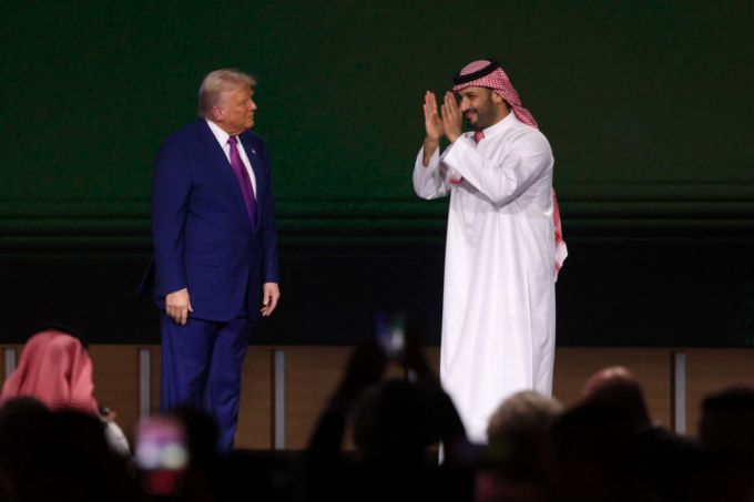 도널드 트럼프 미국 대통령(왼쪽)이 13일(현지시간) 중동 순방 중 리야드에서 열린 '사우디·미국 투자 포럼'에 참석해 무함마드 빈 살만 사우디아라비아 왕세자의 환영을 받고 있다. /AFPBBNews=뉴스1
