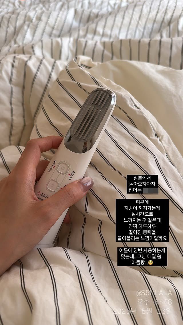 14일 이솔이는 "일본에서 돌아오자마자 집어든"이라며 "피부에 지방이 꺼져가는 게 실시간으로 느껴지는 것 같은데 진짜 하루하루 떨어진 떨어진 중력을 끌어올리는 느낌이랄까요"이라는 글과 함께 사진을 올렸다.