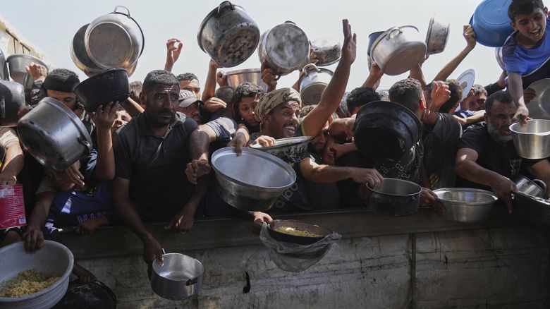 ▲ 따뜻하게 조리된 밥을 배급받기 위해 몰려든 팔레스타인 주민들