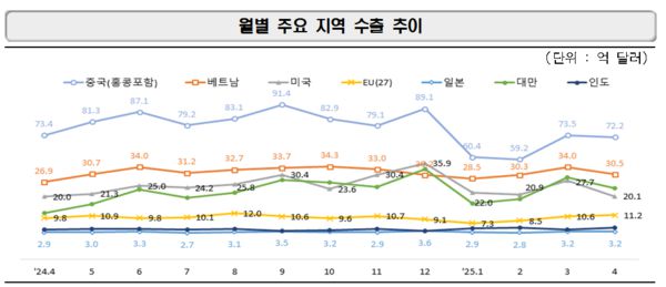 미국과 유럽연합(EU) 수출은 각각 20억1000만달러와 11억2000만달러다. 전년동월대비 각각 0.5%와 14.7% 팽창했다. 미국은 휴대폰 수출이 전년동월대비 287.2% 급상승한 1억6000만달러를 찍었다. 관세 부과 전 밀어내기로 보인다.