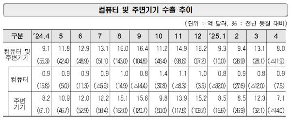 컴퓨터 및 주변기기 수출은 8억달러다. 전년동월대비 11.9% 적다. 컴퓨터는 9000만달러로 전년동월대비 7.5% 높지만 주변기기가 7억1000만달러로 전년동월대비 14.0% 낮았다.