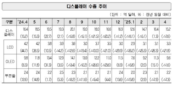 디스플레이 수출은 15억2000만달러다. 전년동월대비 7.6% 축소했다. 유기발광다이오드(OLED)와 액정표시장치(LCD) 모두 부진했다. OLED는 9억6000만달러 LCD는 3억3000만달러를 수출했다. 각각 전년동월대비 1.6%와 21.8% 줄었다.