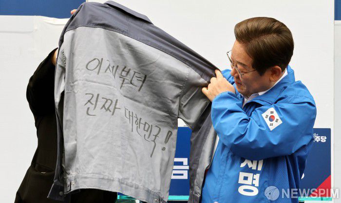 '이제부터 진짜 대한민국' 작업복 바라보는 이재명 후보