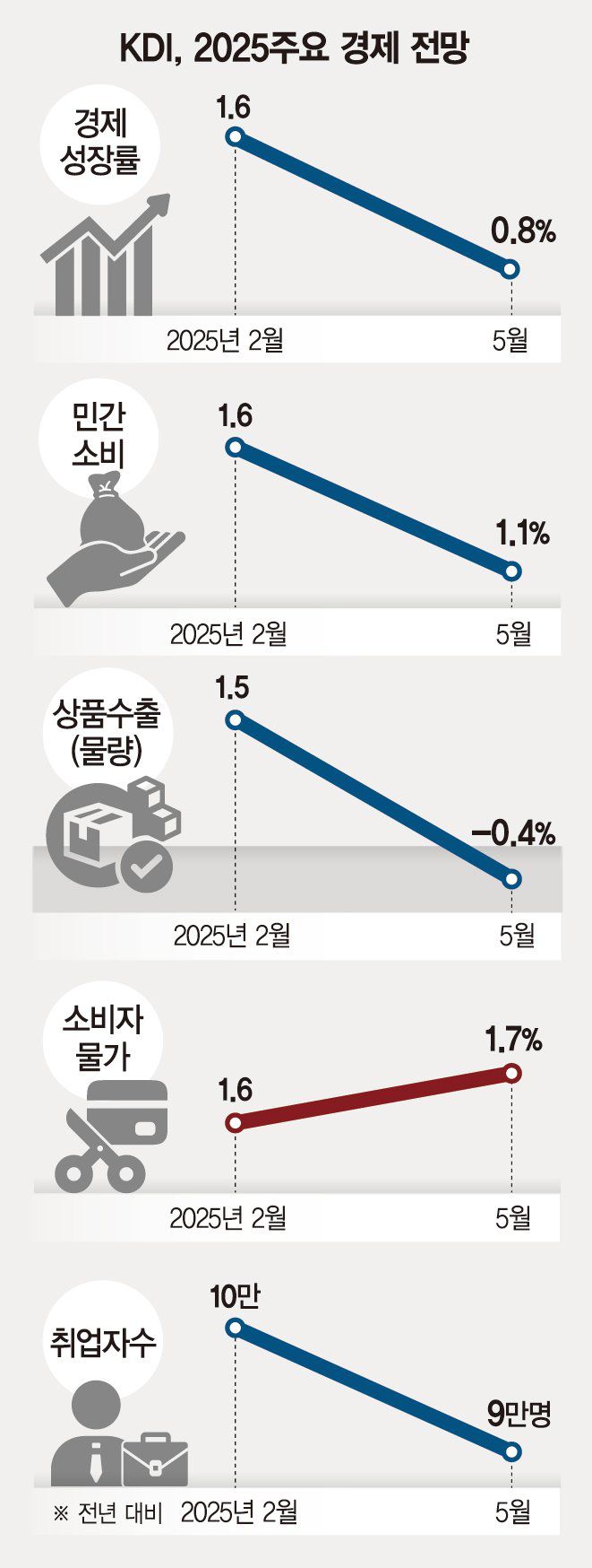 KDI 정규철 경제전망실장은 "2월과 5월 전망 차가 큰 이유는 미 관세 영향 때문"이라며 "자동차, 철강 등에 대한 품목관세에다 기본관세가 부과되면서 수출이 둔화, 성장률을 끌어내릴 것으로 예측됐다"고 밝혔다.