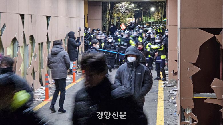 전직 대통령 윤석열 구속영장이 발부된 지난 1월19일 새벽 서울서부지방법원에 침입해 거물과 기물을 파손하며 난동을 부린 지지자들이 경찰과 대치하고 있다. 이준헌 기자 |
