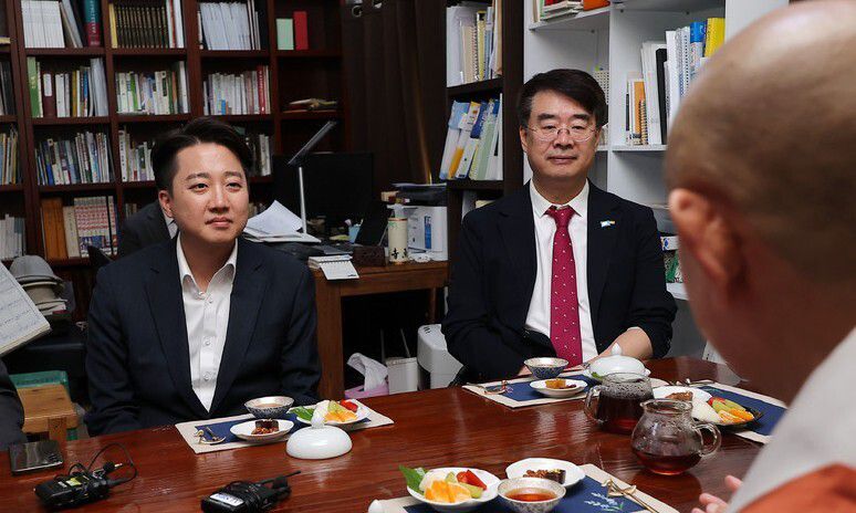 이준석 개혁신당 대통령 후보가 14일 부산 금정구 범어사 안양암에서 국제종교연합 이사장을 맡고 있는 대종사 정여 방장스님, 전국기독교총연합 대표회장인 임영문 목사 등과 간담회를 하고 있다. 연합뉴스