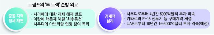 그런가 하면 사우디아라비아로부터 4년간 6000억달러(약 850조원)의 투자 유치를 약속받는 경제 동반자 협정을 맺는 등 실리도 챙기며 특유의 ‘거래의 기술’을 발휘하고 있다.