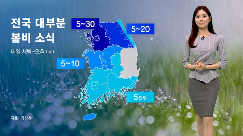오늘도 한낮에는 반소매 차림이 어색하지 않은 날씨였는데요. 내일은 전국 대부분 지역에 비 소식이 있겠습니다. 비는 새벽부터 내리기 시작하겠고요. 대부분 오후 사이에 그치겠습니다. 수도권에는 5~30mm, 그 밖의 중부와 제주도에는 5~20mm, 남부지방에는 5mm 정도 내리겠습니다.