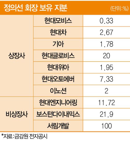 정 회장 개인 지분이 가장 많은 계열사 중 하나는 20%를 들고 있는 현대글로비스다. 현대글로비스는 정 회장 승계 자금줄로 주목받은 계열사다. 현대글로비스는 정몽구 명예회장과 정 회장 부자가 2001년 자본금 50억원으로 설립했으며 그룹 물류를 전담한다. 당초 정 회장 지분율이 약 40%에 달했으나 2005년 말 상장하면서 32% 수준으로 줄었다. 이후 정부 일감 몰아주기 규제를 피하려 2015년과 2022년 두 차례 지분을 매각해 지금의 지분율로 내려갔다.