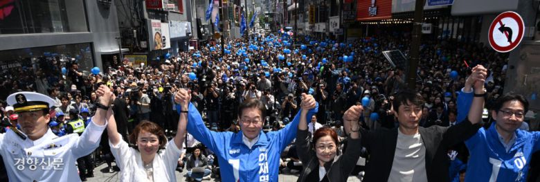 해양대 학생 등 부산 시민 대표들과 함께 이재명 더불어민주당 대선 후보가 14일 부산 서면에서 열린 집중유세에서 부산 시민 대표들과 손을 맞잡아 들고 있다. 박민규 선임기자 parkyu@kyunghyang.com