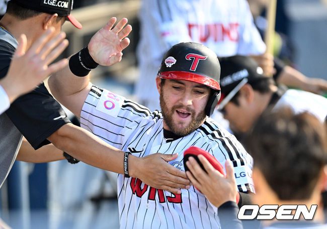 [OSEN=잠실, 이대선 기자] 14일 오후 서울 잠실야구장에서 2025 신한 SOL Bank KBO리그 LG 트윈스와 키움 히어로즈의 경기가 열렸다.LG는 송승기, 키움은 로젠버그를 선발 투수로 내세웠다.3회말 1사 2루에서 LG 문보경의 좌전 적시 2루타 때 홈을 밟은 2루주자 오스틴이 더그아웃에서 환호하고 있다. 2025.05.14 /sunday@osen.co.kr