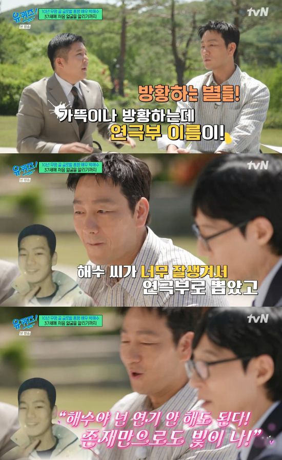 박해수는 "가수 이수영 씨가 제 고등학교 선배님이다. 연극부를 소개한다고 저희 반에 들어오셨는데 '방황하는 별들'이라는 연극부 이름이었다"라며 이수영을 언급했고, 유재석은 "이수영 씨가 그렇게 이야기를 하셨다고 한다. 당시에 해수 씨가 너무 잘생겨서 연극부로 뽑았고 '해수야 넌 연기 안 해도 된다. 존재만으로 빛이 나'"라며 덧붙였다.