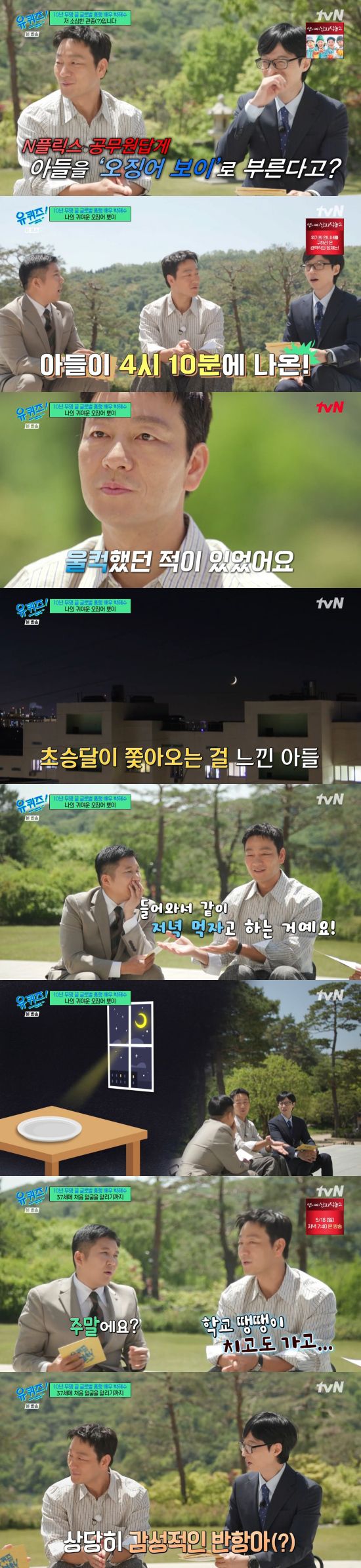 이날 유재석은 "해수 씨가 아드님을 오징어 보이라고 부른다고 한다"라며 궁금해했고, 박해수는 "21년도 9월 17일 '오징어 게임' 나왔다. 오후 4시였다. 오픈이. 아들이 오후 4시 10분에 나왔다"라며 전했다.