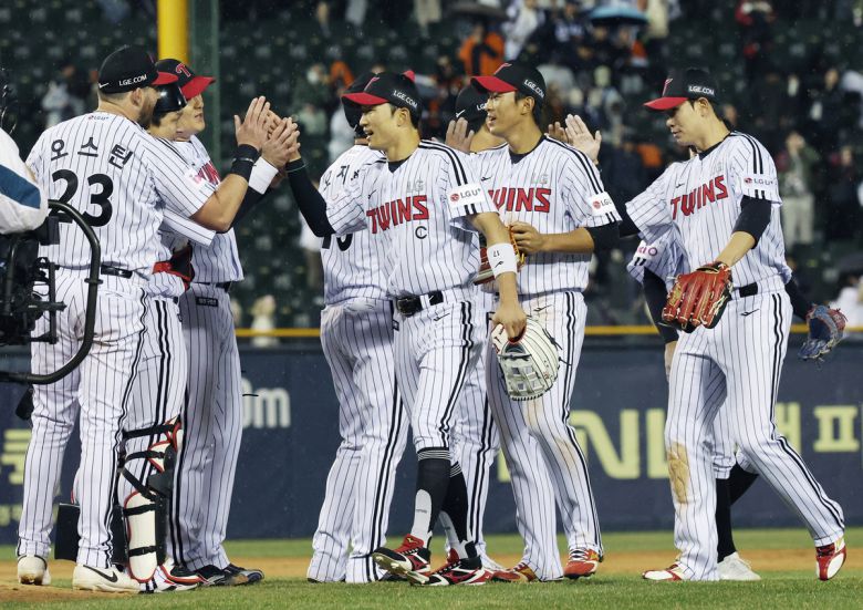 LG 선수단이 승리를 거두고 기뻐하고 있다. 사진=뉴시스 |