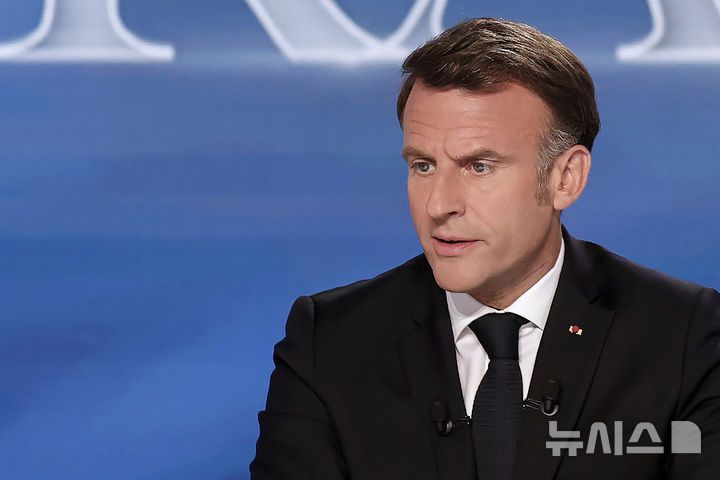 [AP/뉴시스] 에마뉘엘 마크롱 대통령이 13일 채널 TFI의 특별 프로그램에 참여해 말하고 있다 |