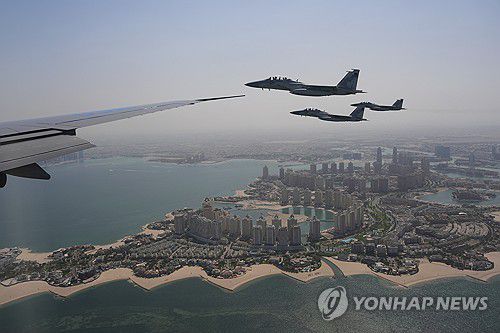 백악관 풀기자단과 외신 등에 따르면 트럼프 대통령은 14일(현지시간) 첫 방문국 사우디아라비아를 떠나 카타르로 이동하는 도중 대통령 전용기 옆으로 카타르 공군의 F-15 전투기가 호위했다.