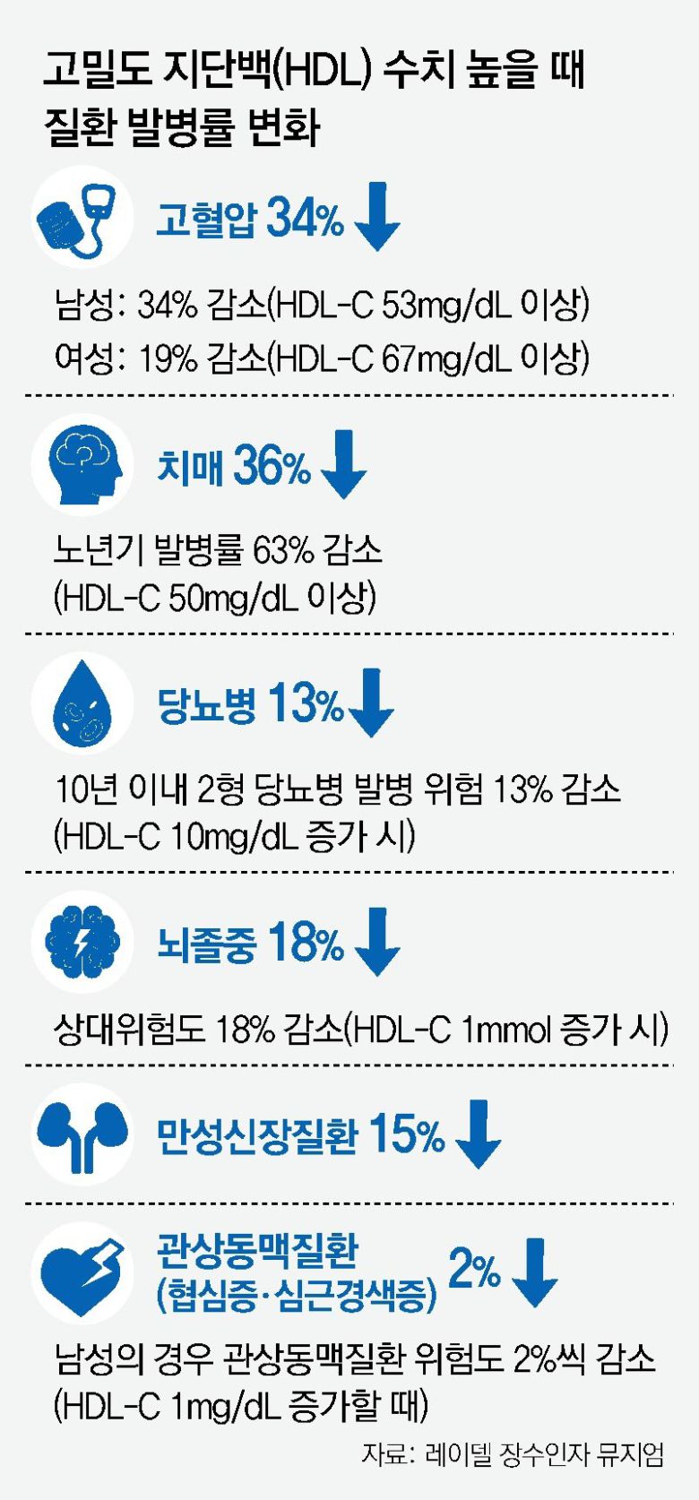 HDL은 동맥경화 원인인 콜레스테롤을 간으로 보내 소각하는 데 중요한 역할을 한다. 혈관 속에 돌아다니는 콜레스테롤을 청소하는 것이다. 최근 동물실험 결과에 따르면 신경염증을 줄이고 인지능력을 향상시키며 동시에 치매 원인인 독성 단백질 베타아밀로이드 축적을 줄인다. 뇌혈관장벽을 HDL이 통과해 뇌에 쌓이는 베타아밀로이드를 막거나 흡착해 제거하기 때문이다. 특히 중년기(평균 54세) HDL 콜레스테롤 수치가 dL당 50mg 이상인 경우 노년기 치매 발병률은 63% 감소했다.