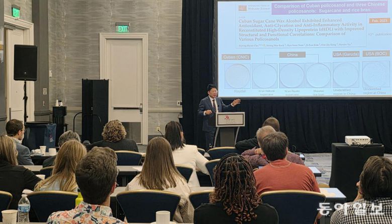 25일 미국 볼티모어에서 열린 미국심장협회(AHA) 학술대회 ‘HDL 워크숍’에서 조경현 레이델HDL연구원장이 쿠바산 폴리코사놀과 카피약 비교 실험 결과를 공개하고 있다. 볼티모어=이진한 의학전문기자·의사 likeday@donga.com |