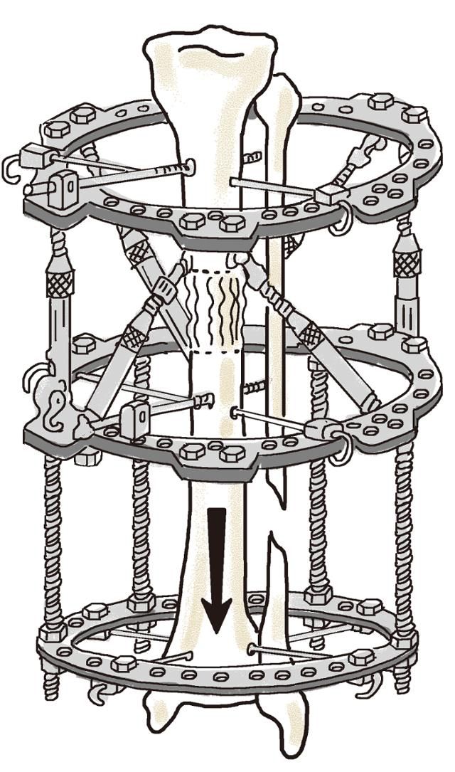 어려운 수술을 드디어 정립한 사람이 구소련의 가브릴 일리자로프(1921~1992)다. 두 개의 종아리뼈 중 정강이뼈를 절골한 후, 외부에서 고정쇠를 박아 수술하는 방식을 택했다. 대퇴골 절골에 비해 훨씬 안전하고 키 성장도 안정적이었다. 상하로 고정하는 방식은 같았으나 6-스트럿(헥사포드) 원형 고정 장치를 통해서 다평면, 즉 3D로 교정하면서 자랄 수 있게 만들었다. 키가 크는 것만이 아니라, 기형을 교정하는 데에도 탁월한 방법을 고안해 낸 것이다.