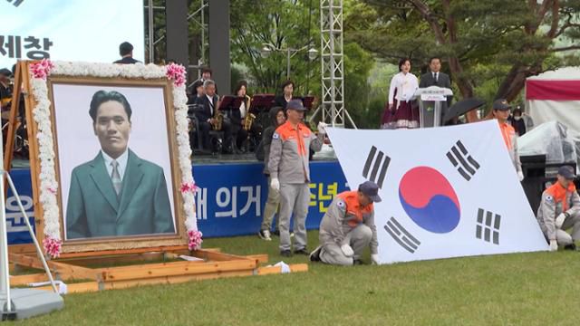 윤봉길 의사 영정이 2023년 4월 29일 충남 예산군 충의사에서 진행된 '윤봉길 의사 상하이 의거 91주년 기념식' 당시 무대 앞에 놓여 있다. 예산=연합뉴스