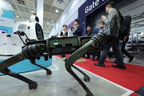 14일 서울 강남구 코엑스에서 열린 ‘제8회 국제인공지능대전’(AI EXPO KOREA 2025)에서 관람객들이 AI 기술을 탑재한 로봇들을 살펴보고 있다. 이번 행사는 한국인공지능협회, 서울메쎄, 인공지능신문의 공동 주최로 16일까지 사흘간 진행된다.