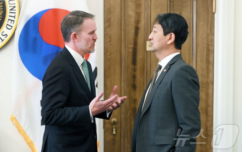 안덕근 산업통상자원부 장관이 28(현지시간) 미국 워싱턴 D.C.무역대표부(USTR) 회의실에서 제이미슨 그리어(Jamieson Greer) 미국 무역대표부 대표와 대화를 나누고 있다. (산업부 제공. 재판매 및 DB 금지) 2025.3.1/뉴스1