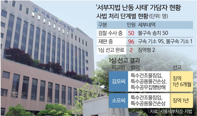 서부지법 난동 사태로 현재까지 96명(구속 95명·불구속 1명)이 재판 중이며, 불구속 송치된 50명은 검찰 수사가 진행 중이다. 최종적으로 재판받게 될 인원은 100명이 넘을 전망이다.