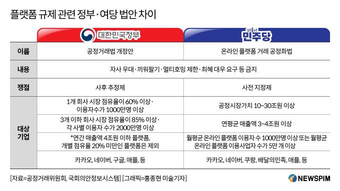 플랫폼법을 둘러싸고 여야간 이견이 빚어졌다. 민주당은 사전 지정제를 포함한 보다 엄격한 수준의 규제책이 필요하다고 주장하며 별도의 온라인플랫폼법을 추진키로 했다.