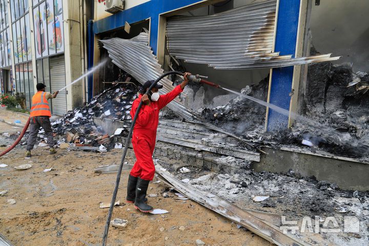 [트리폴리= AP/뉴시스] 무장 군대들 간의 충돌로 파괴된 리비아 수도 트리폴리 거리에서 5월 14일 소방대가 한 서점 화재의 잔불을 끄고 있다. 2025. 05. 15.